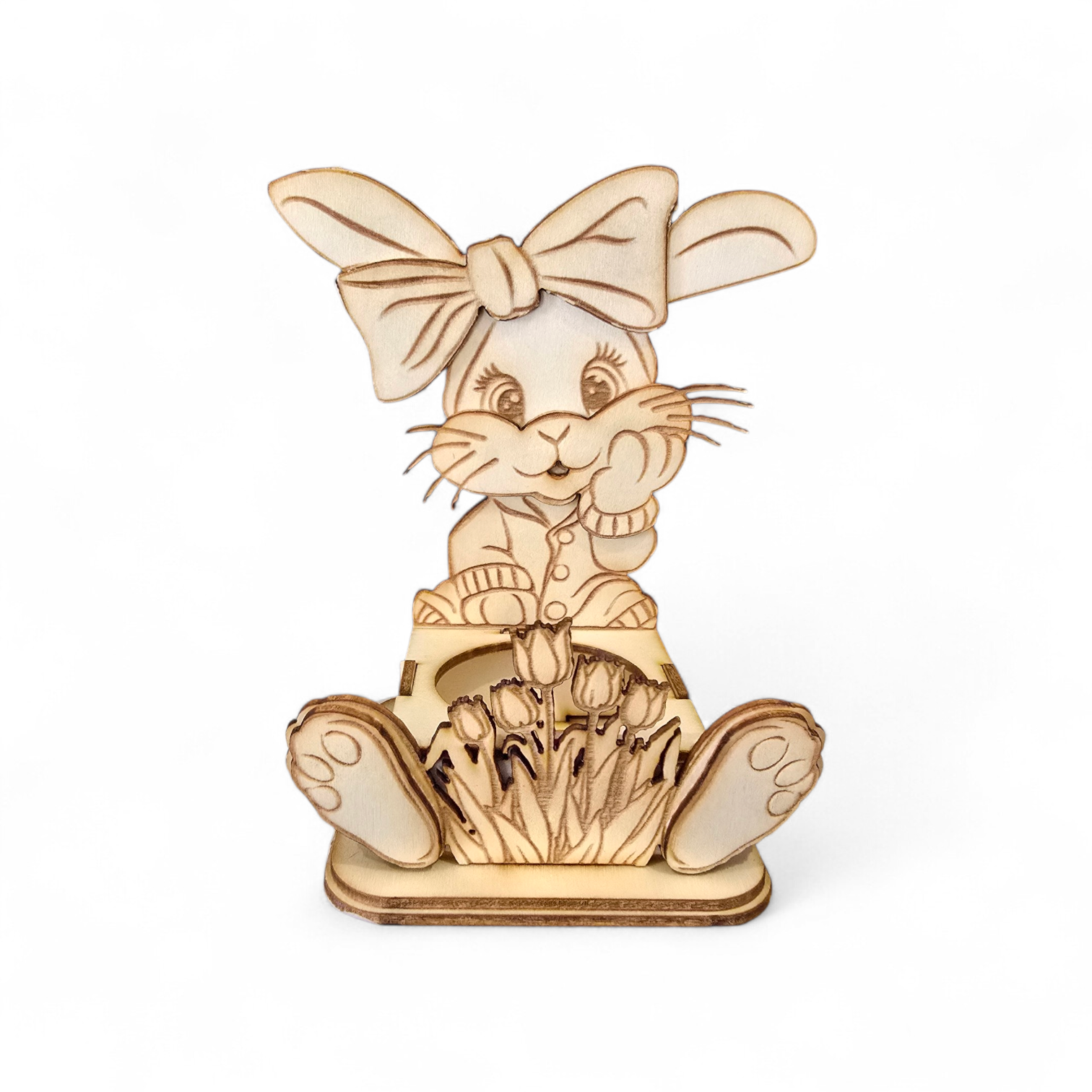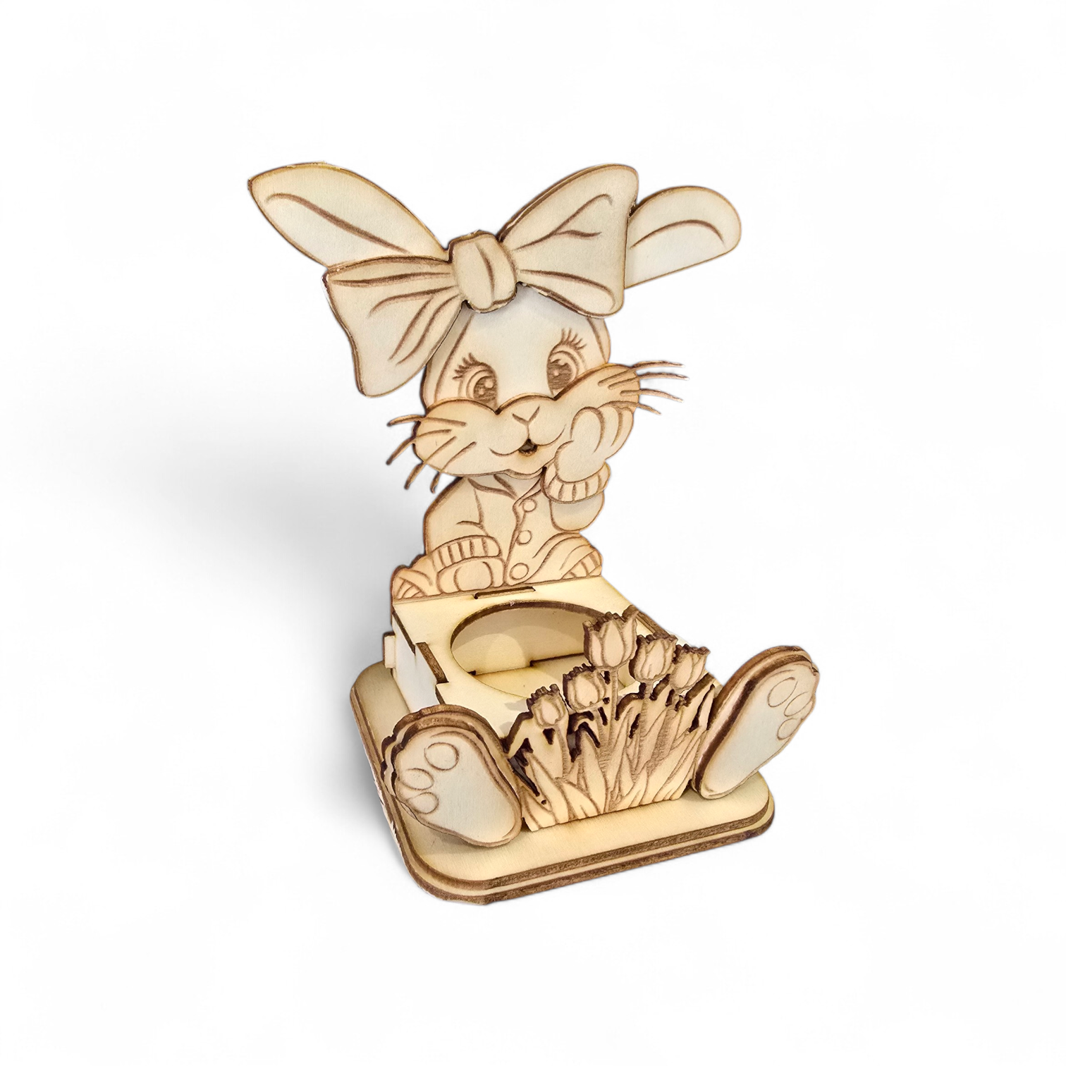 Внесете нежност в дома си с това изящно Великденско Зайче с панделка! Тази лазерно гравирана дървена поставка изобразява сладко зайче сред пролетни лалета. Светлата дървена повърхност е идеална за оцветяване, което дава възможност на Вашите деца да персонализират декорацията по свой вкус. Тя е оригинален начин да изложите боядисаните си яйца и да се забавлявате семейно. Изработена от висококачествено дърво, тази поставка е траен и екологичен подарък, който носи радост. Всяко Великденско Зайче се изработва с любов и внимание към детайла в срок от пет работни дни. Добавете стил и творчество на масата си!