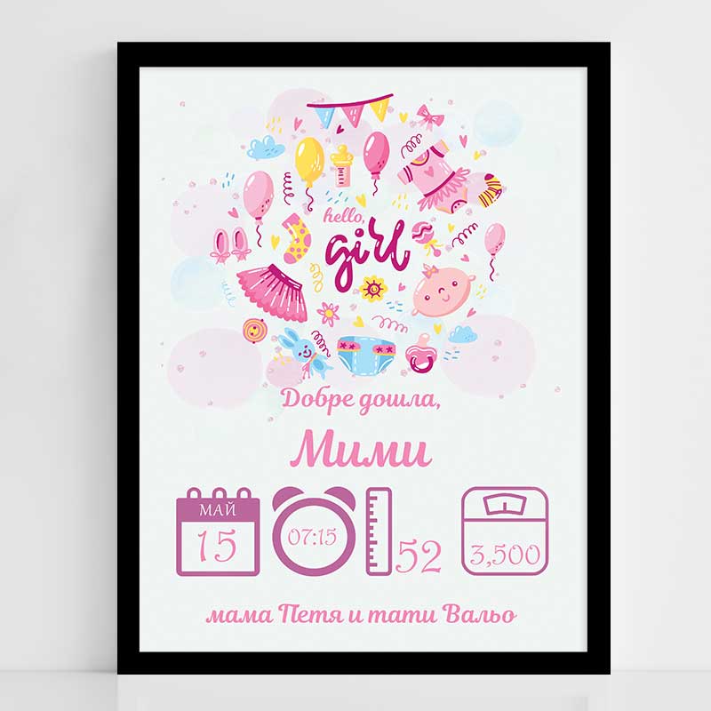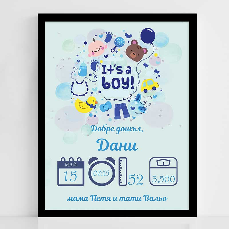 Персонална бебешка рамка-визитка с данните от родилното или за първи рожден ден. Това е прекрасен персонализиран подарък за нови родители, при декориране на детската стая или игралната стая за бебе. Приветствайте всяко мъниче, като запазите неговите данни в красив дизайн, с висококачествен печат и рамка. Цвета на рамките, които предлагаме е само черен. Може да бъдете сигурни, че се отнасяме с професионализъм и отговорно отношение към изработката на всички подаръци. Високо качество и доброто обслужване са най – малкото, което ще получите. Изработката и доставката са в срок от 5 (пет) работни дни. Доставката се извършва от куриерска фирма.